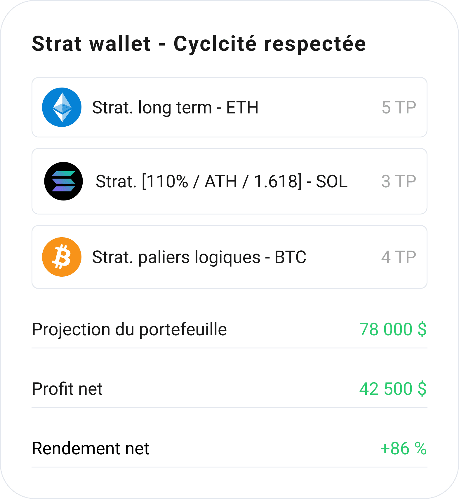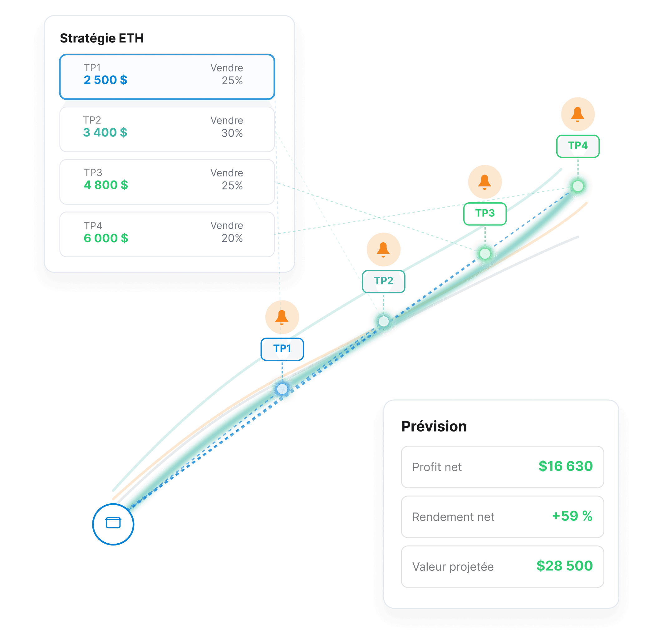 Pour chacun de vos tokens, définissez plusieurs stratégies selon vos objectifs. Pendant que vous les bâtissez, exStrat simule en temps réel l'impact de chaque prise de profit et vous aide à comparer vos plans avant d'agir.